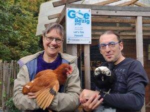 Het thema van de GoeBezig-prijs van 2023 was “Ontharden van de gemeenschap (naar een warmer samenleven)“, waar ons project uiteraard perfect in past. Naast de cheque die we mochten ontvangen (wat integraal naar de aankoop van graantjes voor de kippen gaat), was vooral de erkenning voor ons project een mooie opsteker. Lees méér over de GoeBezig-prijs op de website van Vlaamse Vereniging Dorpsbelangen.