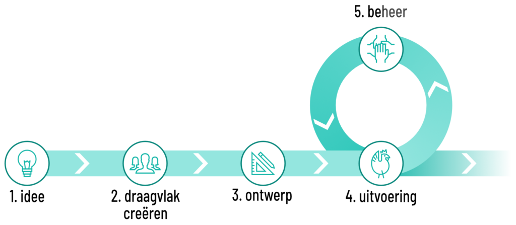 Onderstaand schema kan een leidraad zijn om zelf aan de slag te gaan. In elke stap vertellen we hoe het bij Let’s Tok verlopen is, maar besef wel: jouw kippenproject zal anders verlopen, omdat jij anders bent en je locatie, stad of gemeente, partners of context ook verschillend zijn.