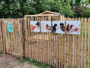- Duidelijke communicatie: toen we een GO kregen van de stad hebben we een logo laten ontwerpen door studente grafisch ontwerp Chloë Zeelmaekers aan PXL-Mad en het logo ook meteen groot op het hok geschilderd. Daarnaast hebben we samen met de stad een bord gemaakt om het project aan passanten te duiden. Een half jaar later hebben we ook de foto’s van alle kippen met hun naam gemaakt.
